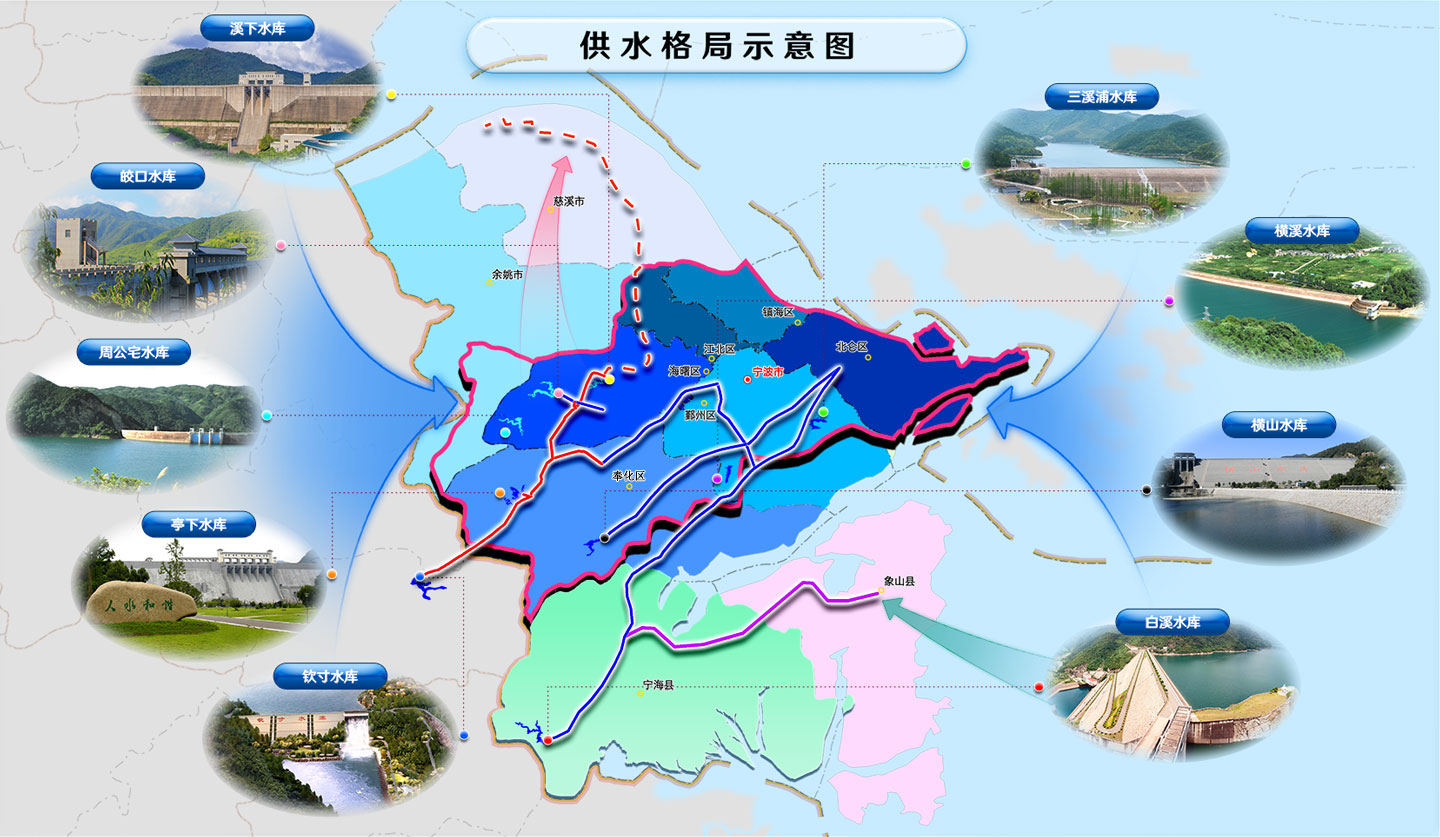 寧波原水集團供水主要水源包括已建的白溪水庫、橫山水庫、周公宅水庫、皎口水庫、亭下水庫(肖鎮河道)、橫溪水庫、溪下水庫、三溪浦水庫,在建的欽寸水庫、葛岙水庫,以及西溪(黃壇)水庫、姚江等水源。水源特點為數量多,庫容不大且大小不一,地域分散,分布于全市境內甚至境外。